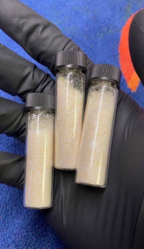 - Farbe & Textur: Hochreines DMT erscheint typischerweise als weißes oder cremefarbenes kristallines Pulver oder als nadelförmige Kristalle. Geringere Reinheit kann aufgrund von Pflanzenölen und Verunreinigungen gelbliche, orangefarbene oder bräunliche Töne zeigen.